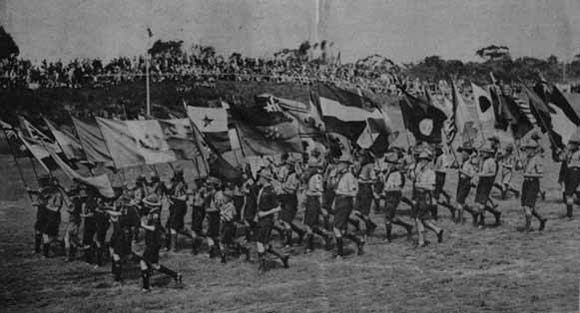 The plight of the girls was diverted by the entry of the Scouts. Line upon line of Scouts flowed onto the arena. The overseas contingents led the way. Scouts passed the saluting dais were the Chiefs took the salute. Many put "hats on staves" as a mark of respect, others cheered and smiled. The South Australians sang their state song. And so they came, contingent following contingent. Vast hordes entered the arena.