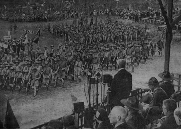 Before a gathering of 12,000 people, including many of Australia's most distinguished citizens, and in the presence of the Chief Scout of the World (Lord Baden-Powell), the Australian Jamboree was opened on Saturday by the Governor General of Australia (Sir Isaac Isaacs). It was a stirring occasion as will live forever in the memory of all who were privileged to take part.