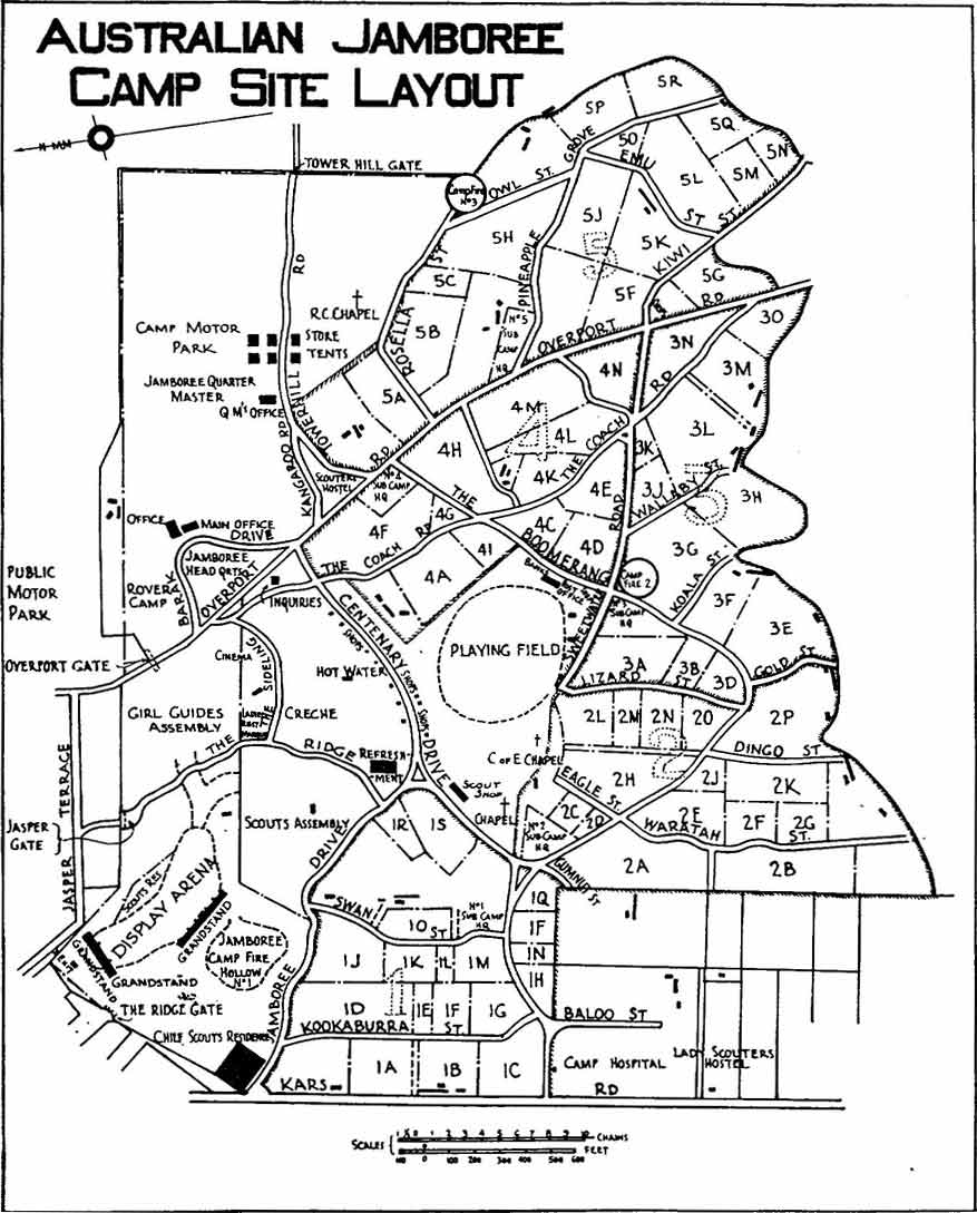 On the map of the camp site, sub-camps are distinguished by the use of the figures 1, 2, 3, 4, and 5. Contingent camps are marked alphabetically, and from the key it is possible to pick out on the map the camping place of any party.
