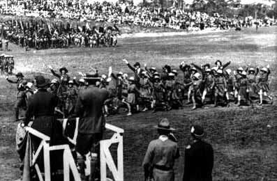 Mounting the dais, Lord Baden-Powell prepared to address the Scouts and, in response, they placed their hats on staves and thumb-sticks and cheered resoundingly. Standing at the salute and smiling, the World Chief acknowledged their greeting.