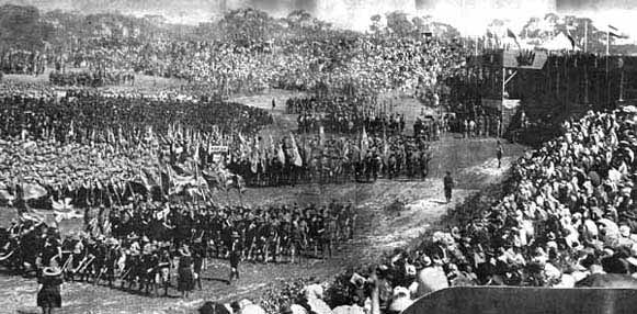 The ardour of the throng reached fever pitch; dust drowned the arena; and the blazing heat became unbearable. Urgent action was imperative: before the last 6,000 Melbourne Scouts had passed the dais, the march past was stopped.