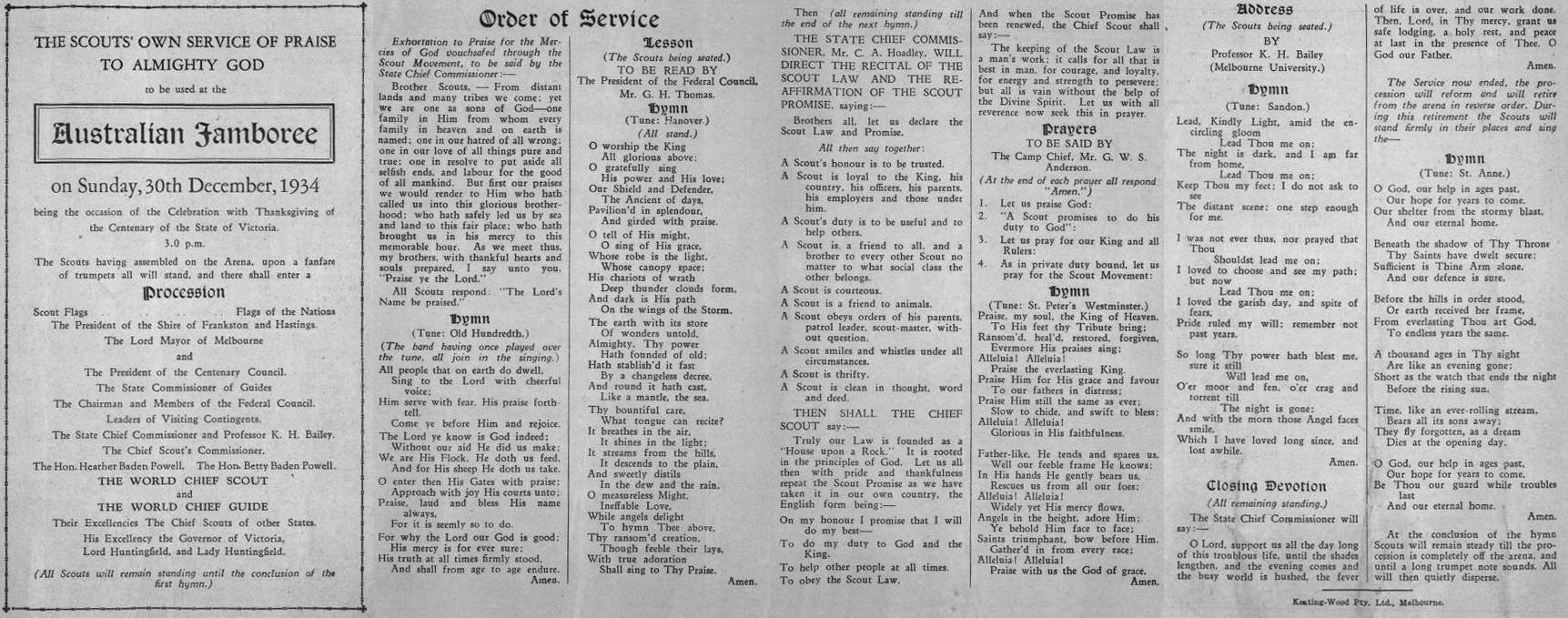 "Breathing a spirit of lofty idealism, the proceedings at the ... Rover Moot, held at the Jamboree camp were characterised by a refreshing appreciation of the obligations of man to man. This Rover Moot was the articulation of the young ideal in terms of service to others." (The Age, 13th January, 1935.)