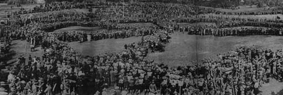 January 1st was the Jamboree's biggest day. When the gates opened hundreds were waiting to enter. From then on people poured into the camp. Local buses and trains were crammed for most of the day. The stands were booked out early and there was not a vacant space in the public reserve. The Age newspaper estimates a crowd of 35,000, together with 12,000 Scouts and 8,000 Guides. On this day, the Guides and Scouts would pay tribute to their Chiefs.